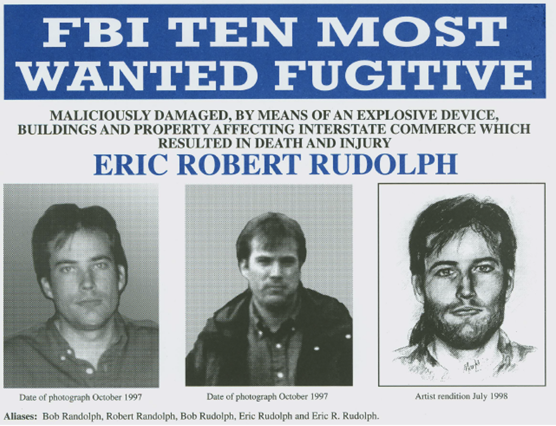 At the height of the manhunt, convenience store signs rearranged the letters of sign boards advertising cigarettes and hot dogs and six packs to read “Run Rudolph Run.” They sold bumper stickers crowning Rudolph “Hide and Seek Champion” and T-shirts with the police sketch of Rudolph’s face saying “This is as close as I’m gonna get to a million,” i.e., the amount of money the government pledged to award anyone who could provide information leading to the fugitive’s capture.