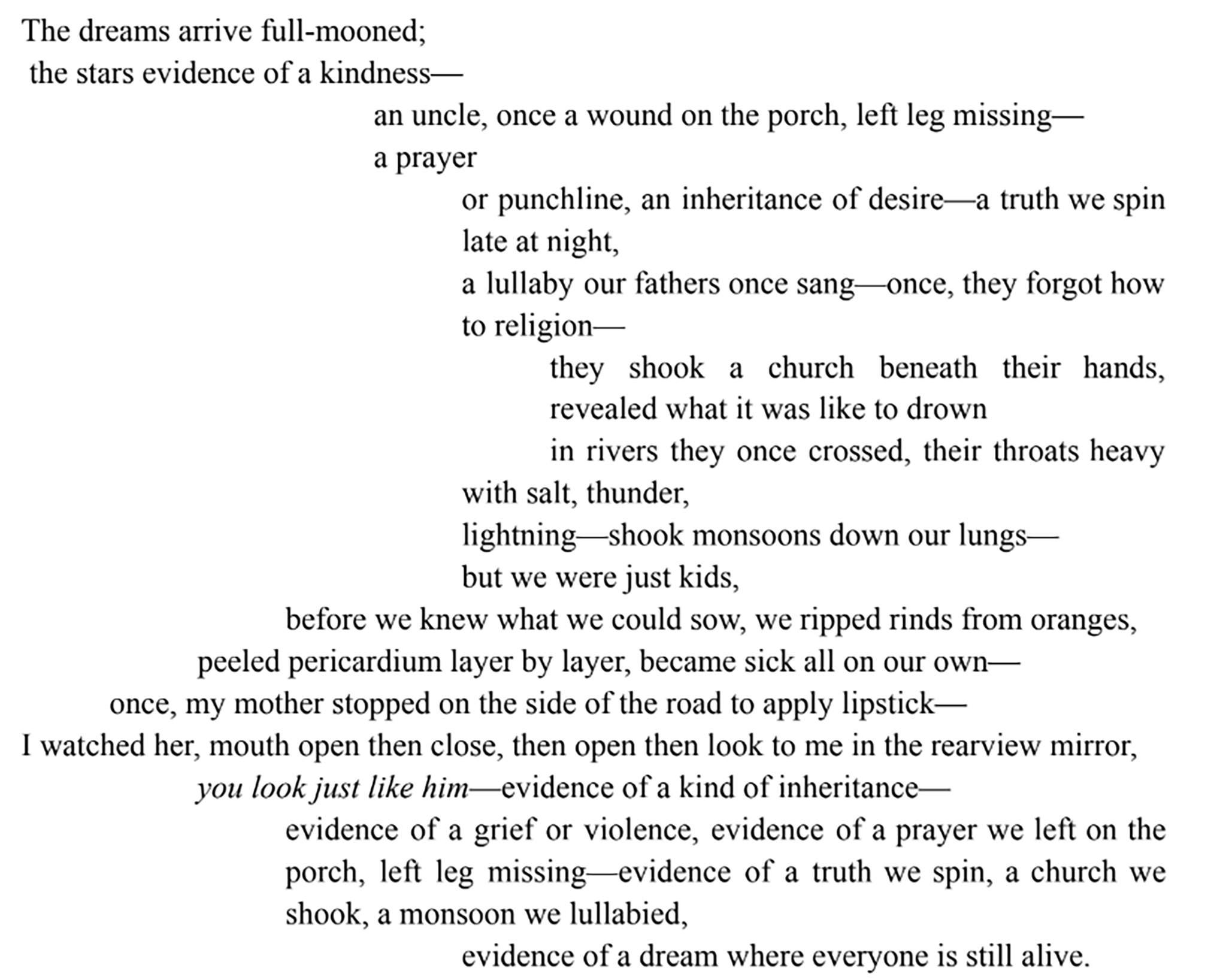 Margarita Cruz’s “Dreaming as Evidence” mesmerizes with its dreamlike structure that mirrors memory’s circular nature. What captivates me most is how the poem’s form — with its indentations creating a visual cascade — physically embodies the way memories spiral and nest within one another. Cruz masterfully weaves together fragments of family history: “an uncle, once a wound on the porch,” (ah!) fathers who “forgot how to religion,” and that striking moment of recognition in the rearview mirror. I love how the repetition in the final stanzas transforms earlier lines into evidence itself, creating a sort of poetic DNA test that reveals inheritance as both blessing and burden. The line “evidence of a dream where everyone is still alive” delivers an emotional punch that reverberates back through the entire poem, suggesting that our dreams might be the most honest archives we have. This is a poem that understands how past and present coexist in our bodies, our memories, and especially in our dreams.